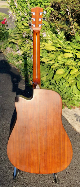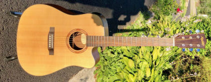 The new Rich Tonewood Series from Xaviere represents the greatest combination of quality, craftsmanship and value EVER in the guitar industry. The 450SCE is an Acoustic/Electric model that features a SOLID USA Sitka Spruce Top from Alaska, a rosewood bridge, Bone compensated saddle and bone nut. The rosewood fingerboard is bound with real Koa wood. The body is bound with binding made up of long grain Koa with ebony and maple purfling. The rosette is Mahogany and Red Maple. Heck- even the inlay dots are maple! The peghead overlay is ebony and the “Xaviere” logo is hand inlaid in real Maple! A soft Venetian cutaway offers excellent upper fret access, and we install a great GFS EAP360 preamp with three band EQ and an onboard tuner! The back and sides are Black Walnut what looks incredible rich but also lends a more pronounced low end to the instrument The 450SCE features a solid Mahogany neck topped off with excellent 14:1 tuners in the “Gotoh” style screw arrangement. Only the best materials have been used to craft this instrument.. even the soundhole label is made from SOLID WOOD! The 450SCE is topped off with a very thin coat of catalyzed urethane- we give this guitar the thinnest of coats because it is a great feeling matte finish. This is an extremely well balanced and toneful guitar- standard Dreadnaught shape with firm bottom, relaxed mids and sweet and clear treble.