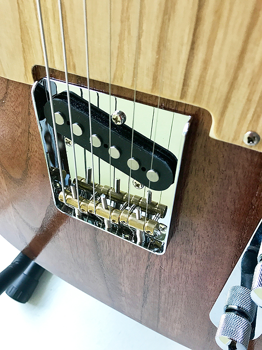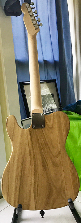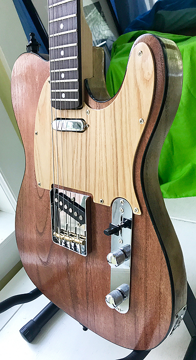 package. Still, Martha has a few blemishes that embarrass her (even though we see them as beauty marks) There’s a light spot about the size of a parsley flake above the ash pickguard that didn’t take the stain quite right, and the clear coat on the corner of the upper bout gets a bit crepe-y. Her nut is a little off (hey, whose isn’t?) and there’s a saw mark on the top side of the headstock. Give a girl a break! Martha’s beautiful!