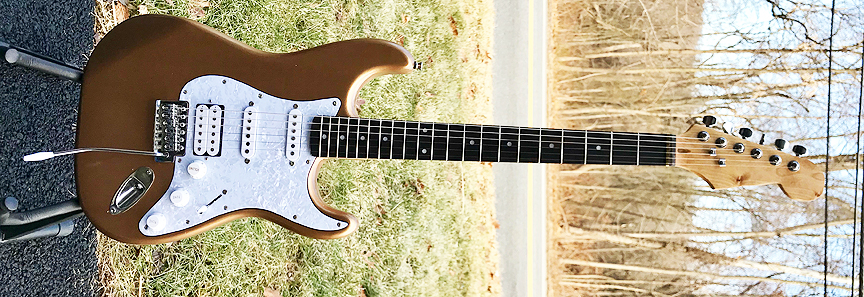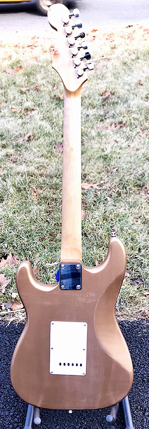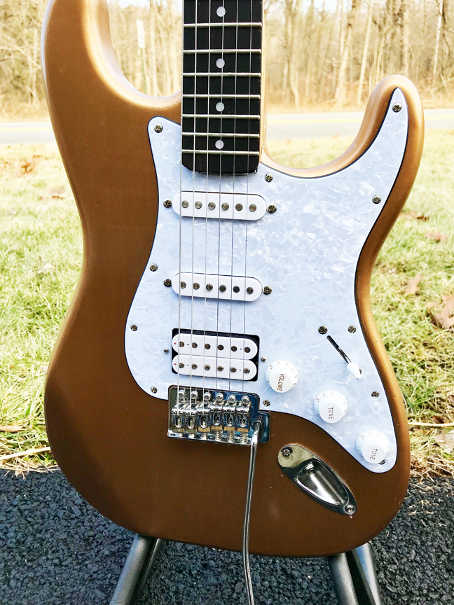 Goldie’s got killer tone courtesy of a HSS pick-up configuration. Pop the switch into the second position, and you get a nice, funky, out-of-phase blend of the bridge humbucker and middle single coil. The single coil in the neck delivers that smooth, buttery, classic Strat tone.