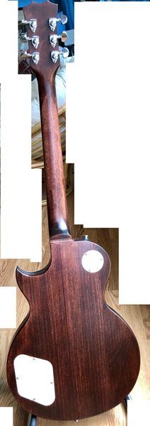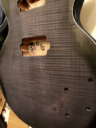 Jennifer Dark’s black-burst finish revealed some surprise imperfections in her maple top. A purplish, nebula-like pattern hovers near the bridge tone knob like a newborn universe, while the gray, tiger-stripe flames dissolve into blackness. After looking into mirrored pick guards, Jennifer Dark opted to go “guard less”, and chrome knobs and pick-up rings are the perfect accents to her dark beauty.