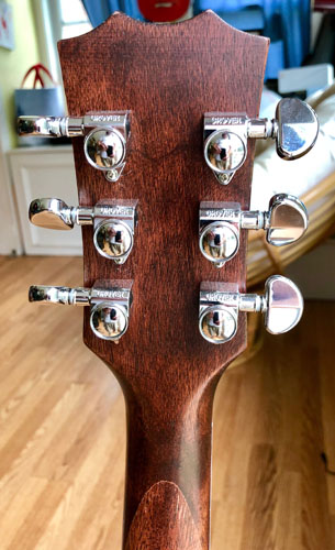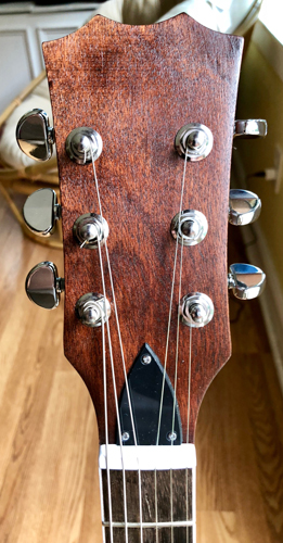 Jennifer Dark is the twin sister of Jennifer Light. The instruments share the same DNA—solid mahogany bodies and necks, flamed maple tops, and genuine Grover Rotomatic machine heads. These girls have the bone structure of true-blue Les Pauls, only with better tuners.