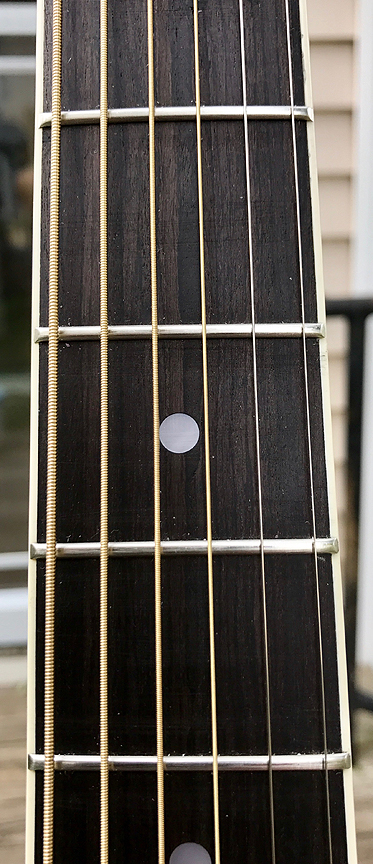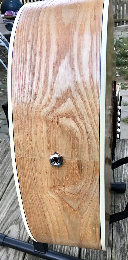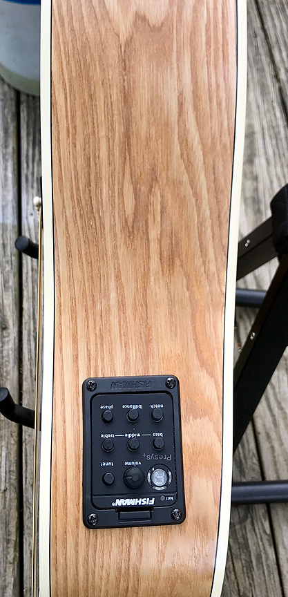 The solution was a bit tacky—I laid a thin strip of plastic (cut from one of my maxed-out credit cards) beneath the piezo pickup itself. Now all the strings amplify at equal volume! Well, the open G is a smidgen quieter, but that just adds to Ashley’s overall unique tonal character. Bear in mind, this is how Ashley sounds through the Fishman pick-up; mic her up in the studio and you’ll find she has a tight, clear tone.
