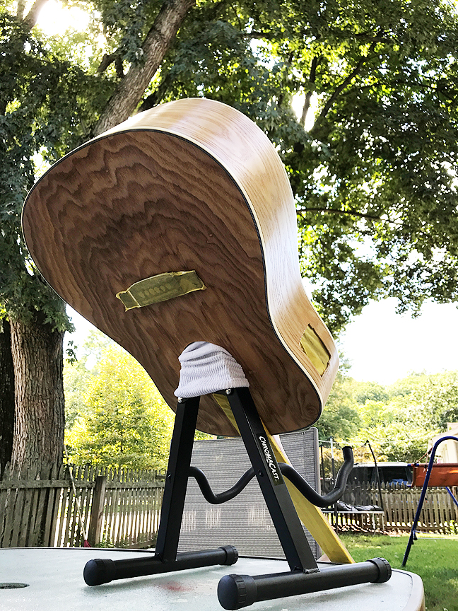 Installing the Fishman pickup system was the hardest part of this build, especially, getting the saddle height and the piezo pickup right. Ashley has low action and a thin, fast neck, but I found the piezo wasn’t amplifying the strings evenly. First the low and high E-strings were too quiet; After an adjustment, the A and D weren’t loud enough.