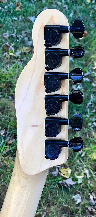 - The back of the headstock — these Wilkinson locking tuners are smooth and solid.