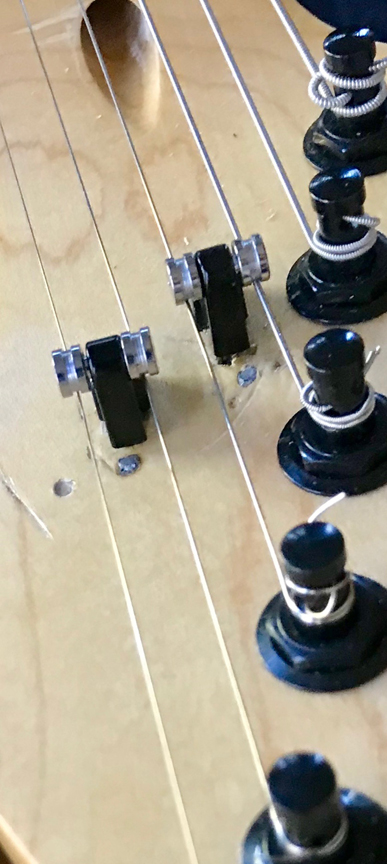 - The string trees — actually upgraded roller trees — came with cheap screws, and a couple broke off in the headstock. We did our best to hide them, but here they are.