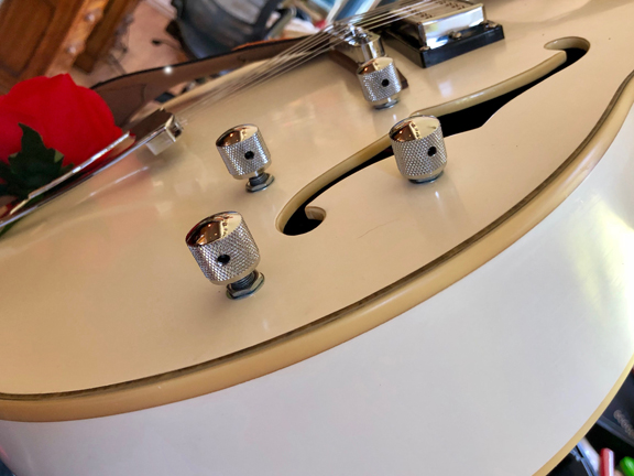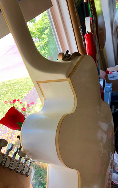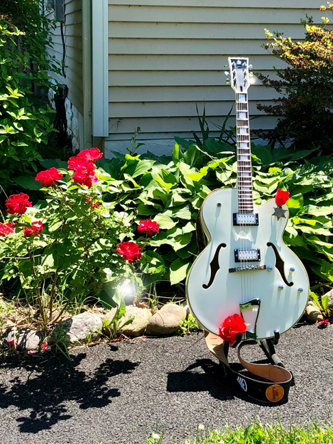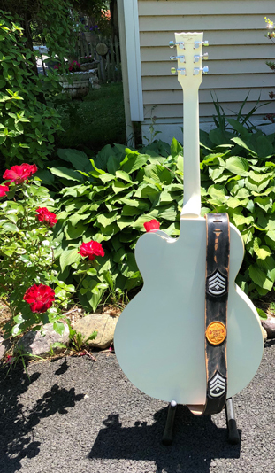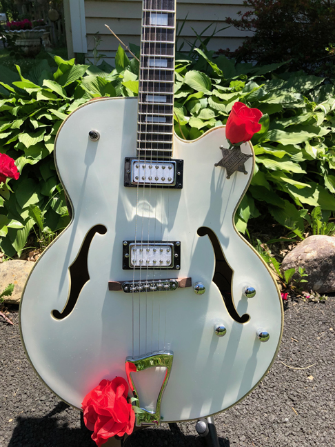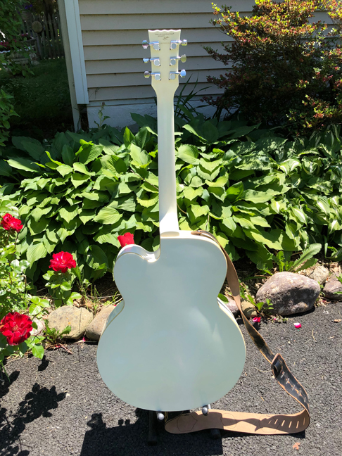 Once upon a time, a mighty maple tree was felled. The tree was lumbered, and the finest cuts selected as tone-woods for musical instruments. Those precious pieces of wood were sent to a luthier in Asia, who shaped, crafted, and painstakingly assembled them into a high-quality arch-top guitar. (Pairing the hollow body with a sweet mahogany neck.) The instrument was painted a muted ivory and routed for Gretsch-style electronics. One day this guitar would be a serious competitor to a White Falcon!
