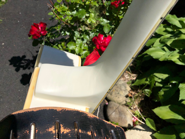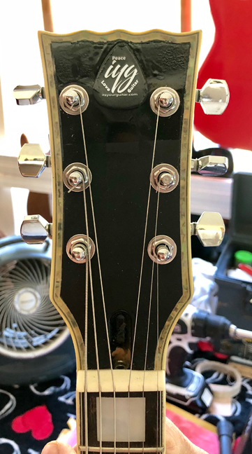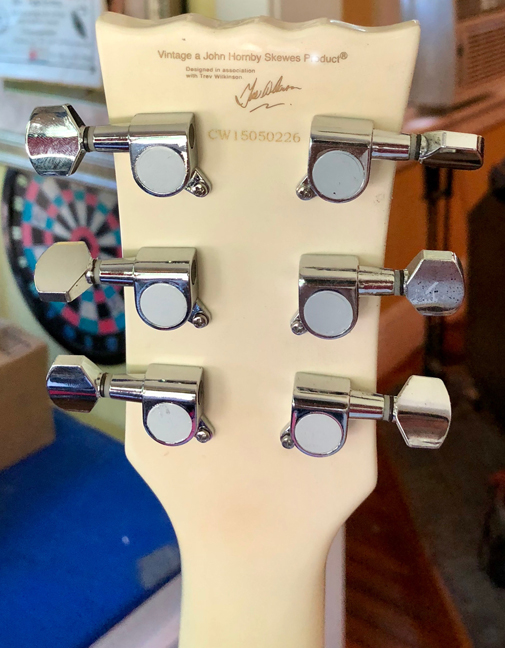 The guitar was shipped to Europe, where is sat in a factory, never assembled, Sheriff Rose was originally commissioned by Vintage Guitars. She may have been a prototype, since this model isn’t listed in the company’s catalog. She’s in great shape other than neglect; faded clear-coat and yellowed binding (a striking abalone inlay). The Fates brought The Sheriff to GuitarFetish.com and then to ItsYourGuitar.com. Rocco and I brought her to life.