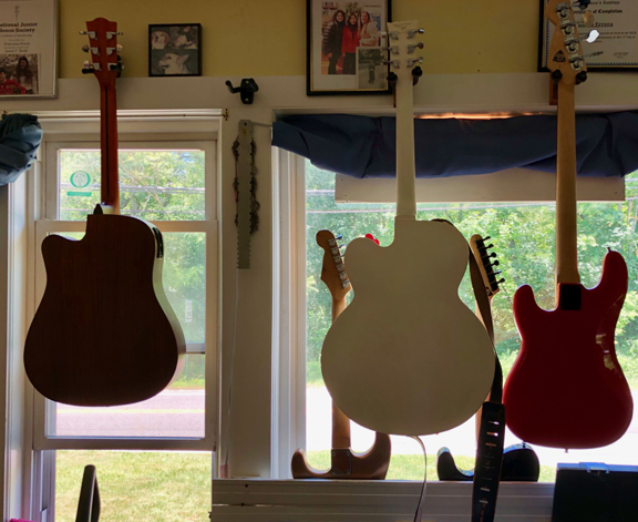 Whoa, big girl! Check out the size of Sheriff Rose compared to this standard dreadnaught acoustic guitar and p-bass.