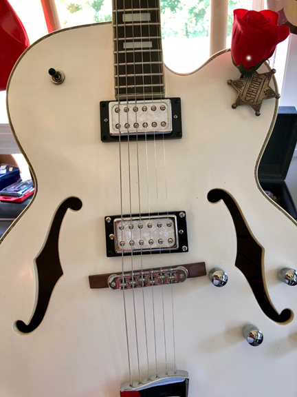 While high register shredders may feel limited by The Sheriff’s 20-fret neck, the Dream 180 humbuckers sound great drenched in distortion, and the big hollow body offers plenty of sustain. We opted for a traditional heavy duty trapeze tailpiece instead of an unstable Bigsby tremolo, and coupled it with a roller saddle, tune-a-matic bridge mounted on a solid piece of shaped rosewood. Sheriff Rose is a unique beauty from top to bottom! Hear her on the tracks below w/ Big Red Bass.